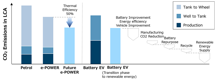• The e-POWER system offers full electric motor drive and electricity is supplied from gasoline engine, and Nissan is promoting technological developments to reduce CO2 emissions by further improving the efficiency of the dedicated engine used to generate electricity.