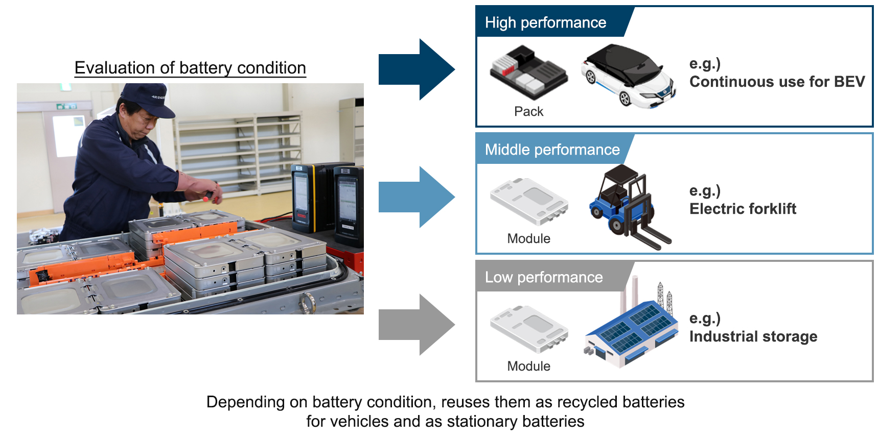 In 2010, Nissan and Sumitomo Corporation established 4R Energy Corporation in order to effectively utilize reusable lithium-ion batteries as electric vehicles become more widespread in the market. 4R Energy has established methods for evaluating the deterioration condition of used lithium-ion batteries collected from the Nissan LEAF, and is promoting a battery recycling business that, depending on battery condition, reuses them as recycled batteries for vehicles and as stationary batteries.