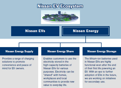Additionally, Nissan has also promoted "Nissan Energy" as one of the solutions to improve the environment surrounding electric vehicles and to provide customers with a richer life.
