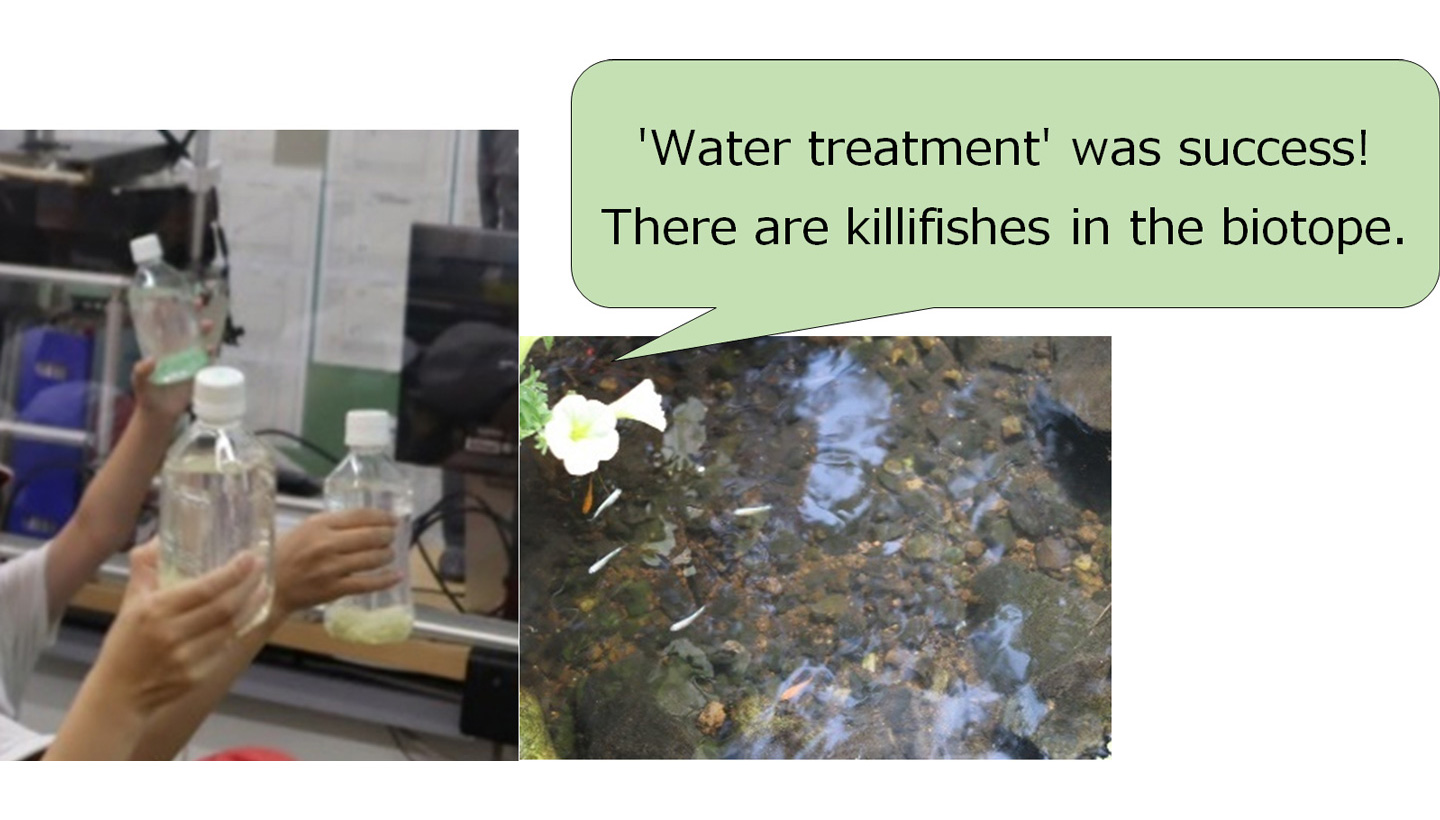 On the site of the Plant there is the biotope where we are raising fireflies using the regenerated water after the treatment and the students observed the killifishes swimming.