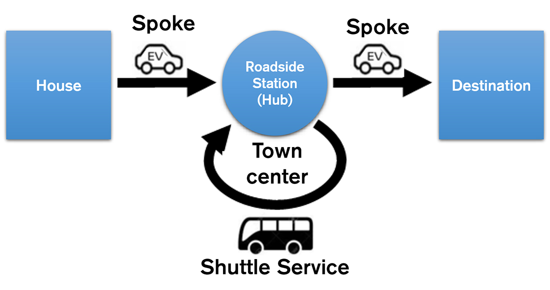 Now, imagine a bicycle wheel. At the centre is a hub, a roadside station or a similar facility. Shorter routes, or spokes, fan out from this hub to homes, businesses or shops. Now imagine there are two or more wheels, with an EV shuttle service that connects the hubs.
