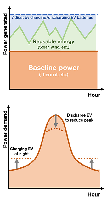 Electric car batteries are designed to charge and discharge large amounts of electricity during acceleration and deceleration. In other words, they regulate an unsteady demand instantaneously. The cars are also made to hold onto power when it’s not needed.