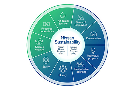 Nissan’s purpose places sustainability at the core of the business. This means working toward a cleaner, safer, more inclusive world continues to define how we develop products, technologies, and services. From talent management to supply chain to product design and the entire lifecycle of our products, sustainability is a priority throughout Nissan’s business. We have accelerated our sustainability strategy by introducing the Nissan Green Program 2030 (NGP2030) and Nissan Social Program 2030 (NSP2030). These programs will help us realize our Ambition 2030 vision.