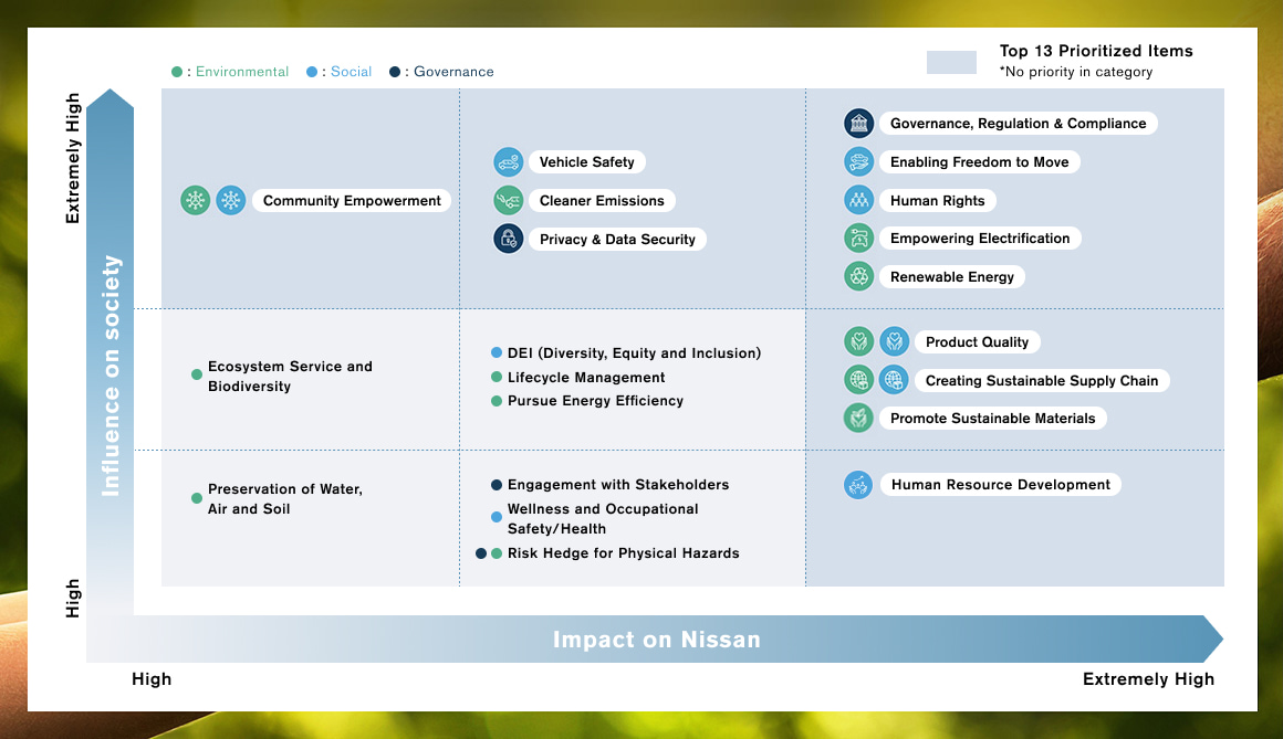 Nissan has identified 21 material issues through a comprehensive materiality assessment, each of which is critical to the company's long-term sustainability. Among these, 13 materiality items have been determined as the most important. By presenting these issues in a materiality matrix, Nissan aims to clearly communicate its strategic direction toward 2030. This approach is designed to expand opportunities for collaboration and deepen relationships of trust leading to the further promotion of initiatives.