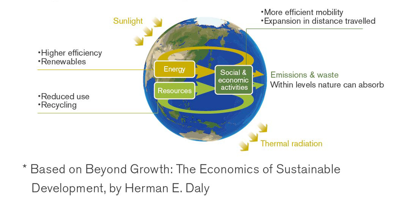 We will manage the environmental impact caused by our operations and products to a level that can be absorbed by nature and pass on rich natural capital to future generations.